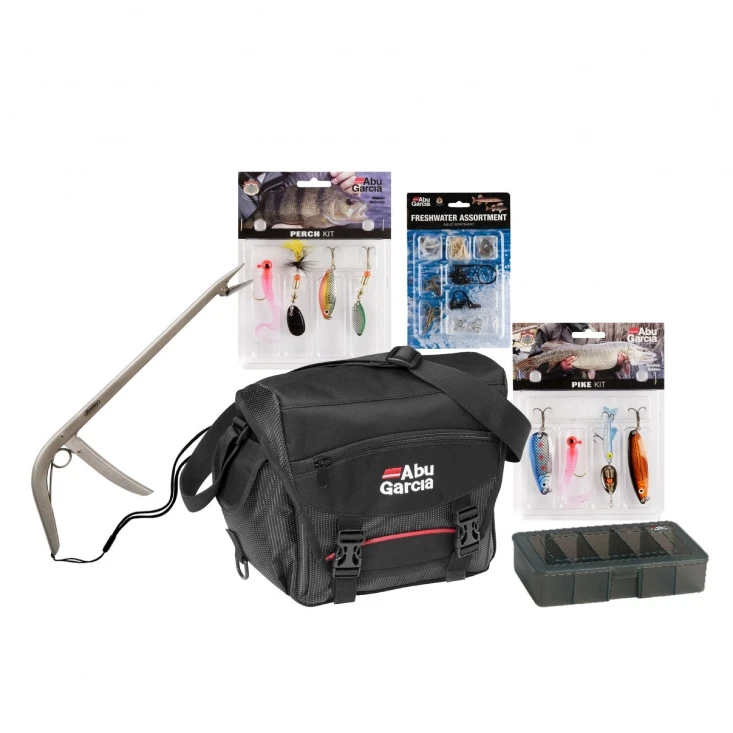 Mooie vistas voor wie wil beginnen met vissen, hij bevat leiders en snaps, een pakje aas voor baars en een voor snoek, en een doosje om ze in te doen.