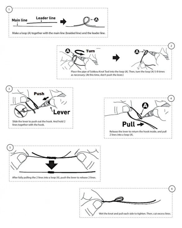 Soms kan bij koud weer of wind de verbinding tussen leader en gevlochten hoofdlijn alleen met enige ervaring of veel moeite worden gelegd. Met de Sokkou knooptang vormt deze verbinding geen probleem meer. Toepasbaar voor mono leaders tot ca. 0,40mm en gevlochten hoofdlijnen tot ca. 0,25mm.
