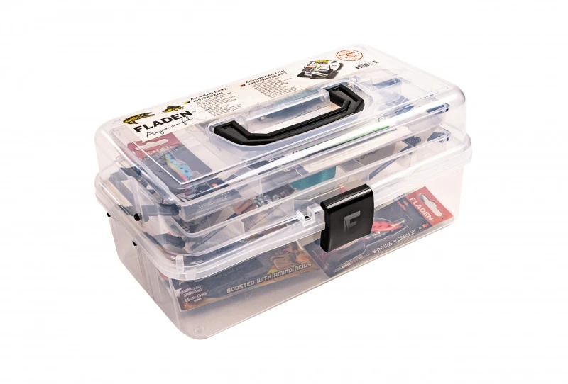 Tackle box heldere bovenkant en heldere onderkant. Zwart deksel met Fladen-logo.