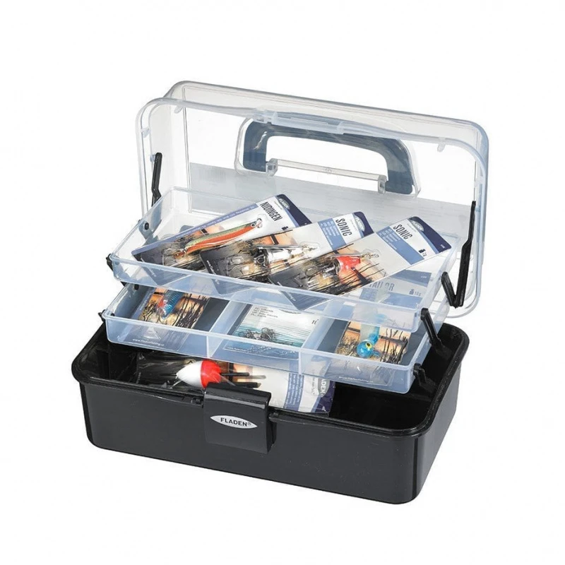 Baitbox met twee niveaus en accessoires voor het vissen op meren.