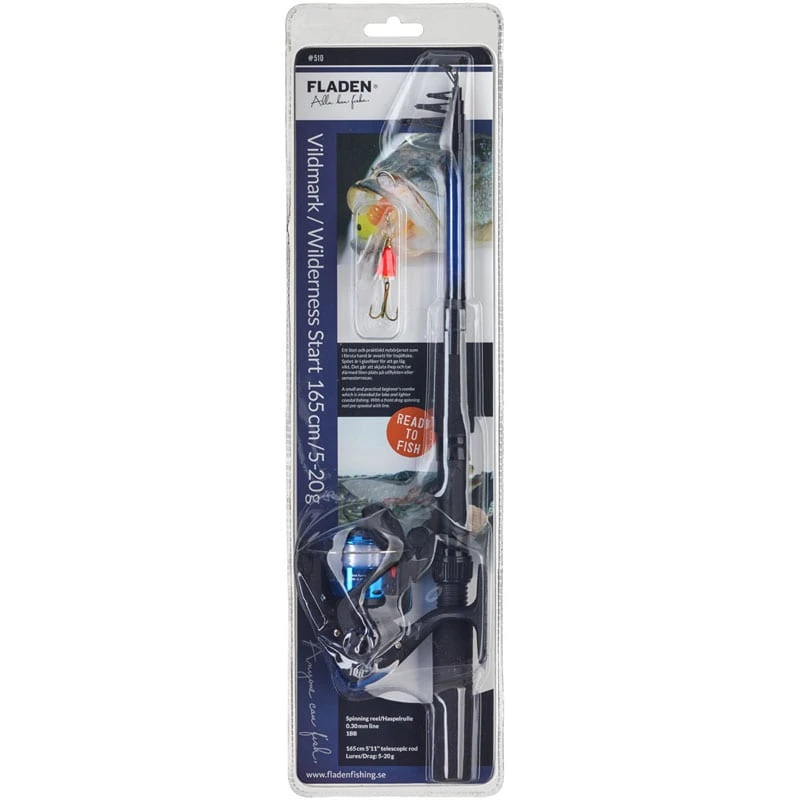 Fladen Start Vildmark Combo is een voordelige visset met een telescopische fiberglas spinhengel, spinreel met nylon lijn en een spinner. Perfect om mee te nemen op vakantie en te wandelen!