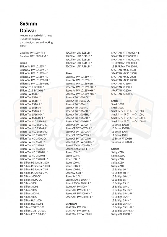 Admira, Blast, Daiwa SS, HRF, Ryoga, Advantage, Vadel, Alphas, IT’S, Aird, Catalina, Zillion, Steez, SPARTAN, Smak, Saltiga, Saltist, Daiwa T3, Daiwa Z, Tatula, Tanasensor, Fuego, MILLIONAIRE, Morethan, Light game ICV, KYOHGA, Kohga, Tatula TWS 300, 301