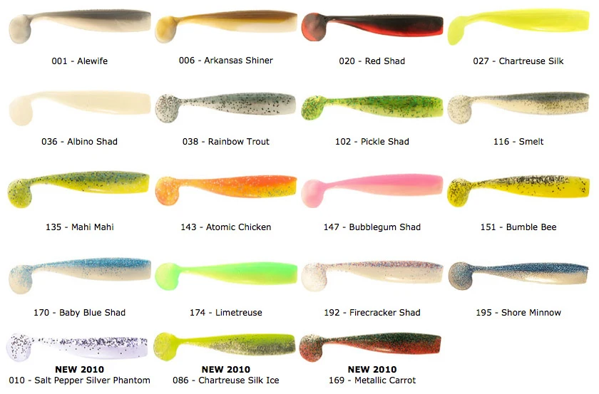| Select | Alewife, Arkansas Shiner, Atomic Chicken, Baby blue shad, Chartreuse Silk, Chartreuse Silk Ice, Goby, Limetreuse, Mahi Mahi, Metallic Carrot, Motor Oil Silver Flake, Rootbeer Shiner, Sexy Shiner, White Gold |