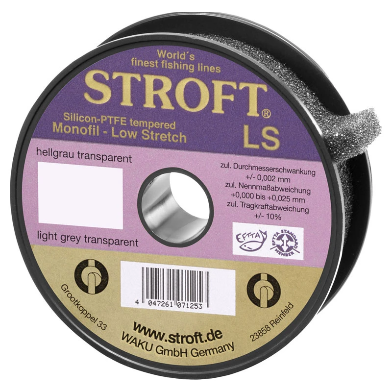 Stroft LS 100m is een transparante monofilament lijn met extreem weinig rek. Effectief als haaklijnmateriaal voor de hengelsport of vliegvisserij!